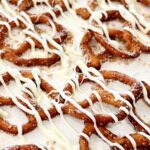 When the pretzels come out of the oven, transfer them to parchment paper on countertop and sprinkle cinnamon sugar mixture over the warm pretzels. Let sit for 10 minutes, then start preparing the white chocolate. Put the white chocolate chips and oil into a microwave safe bowl. Microwave in 20 second intervals, stirring between each, until the white chocolate is just melted. Transfer to a plastic baggie and snip the corner off, drizzle white chocolate over the pretzels. Let the white chocolate harden at room temperature before transferring the pretzels to an air tight container to store.