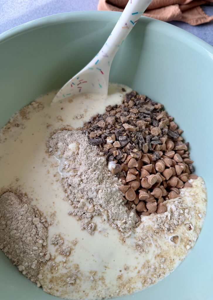 To the bowl, add the cold wet ingredients, butterscotch chips and Heath toffee bits. Gently mix until just combined.
