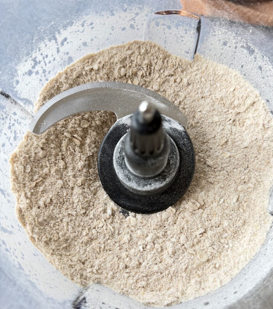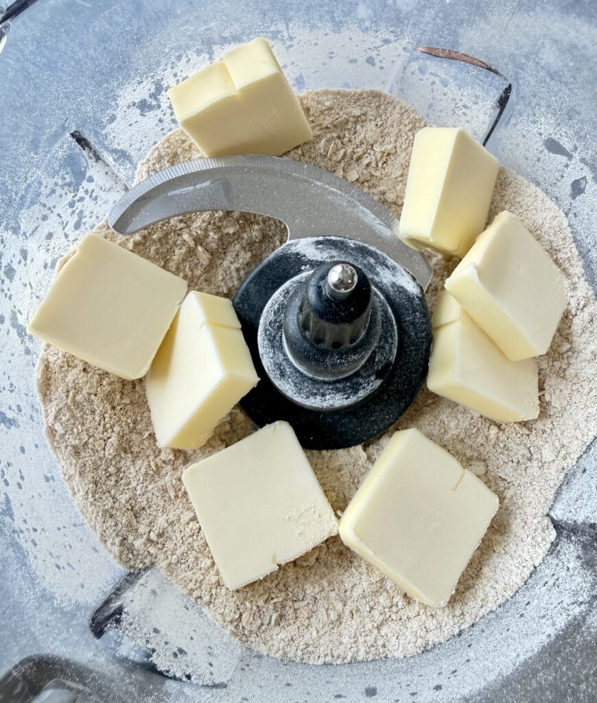 Flour, oats, brown sugar, cinnamon, baking soda, baking powder and saltAdd the chunks of butterPulse until the mixture resembles coarse crumbs
