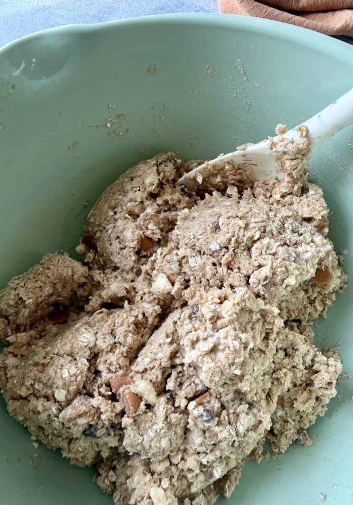 For more oat texture add half of the oats at the beginning and add the other half when you mix in the liquid and chips.