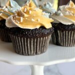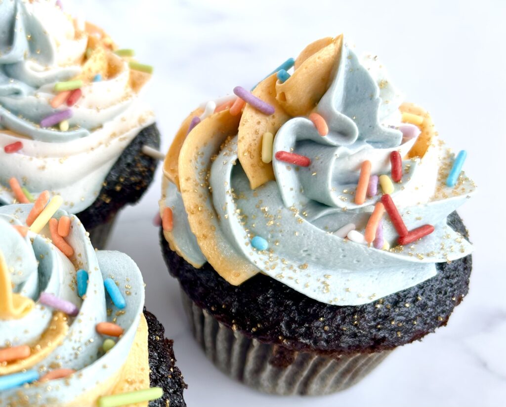 This link will take you to my very favorite Easy Vanilla Buttercream Frosting. It has just a very little bit of almond extract and it’s the most perfect fluffy frosting you’ll ever taste. It makes more than you need for 12 cupcakes, just spread it on some graham crackers, yum! The frosting will save in the fridge for a few days. Let it come to room temperature and beat with a mixer to bring it back to life. These cupcakes also pair nicely with peanut butter frosting or cream cheese frosting.